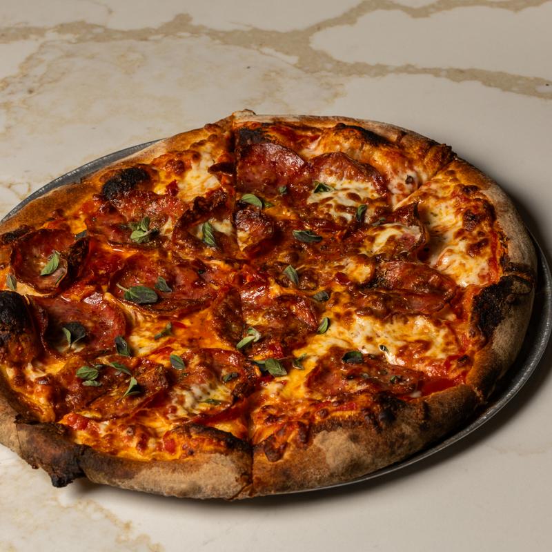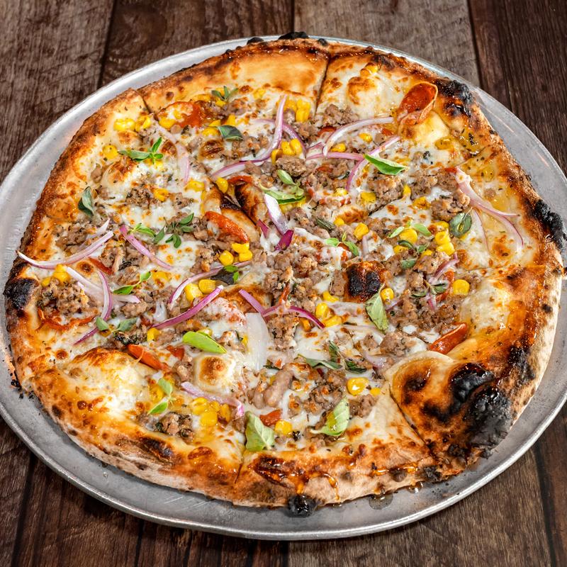 EVOO, shredded mozzarella, fontal, sausage, pepperoni, corn, shallots, honey, oregano