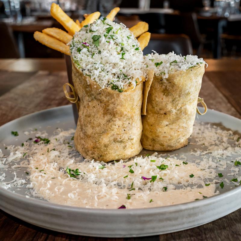 Warmed tortilla, fire roasted chicken, romaine, crouton, b&b caesar dressing, fried capers.