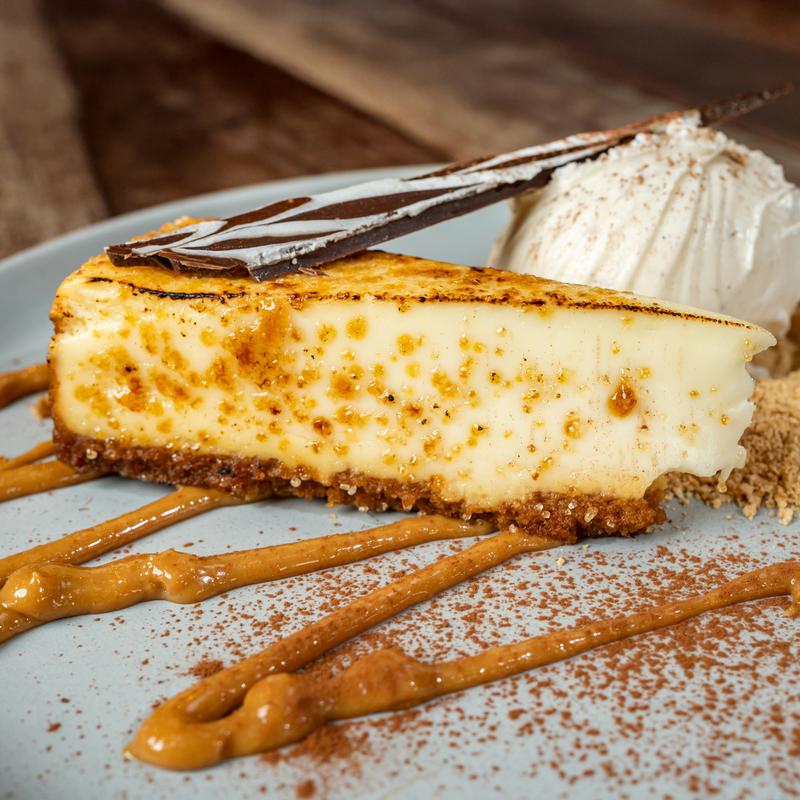 Buttery Graham Cracker Crust, Cheesecake Filling, Caramelized Sugar