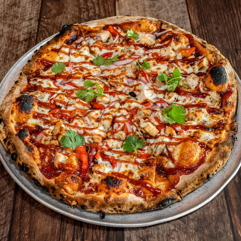 BBQ sauce, chicken, shredded mozza, peppers, onions, cilantro
